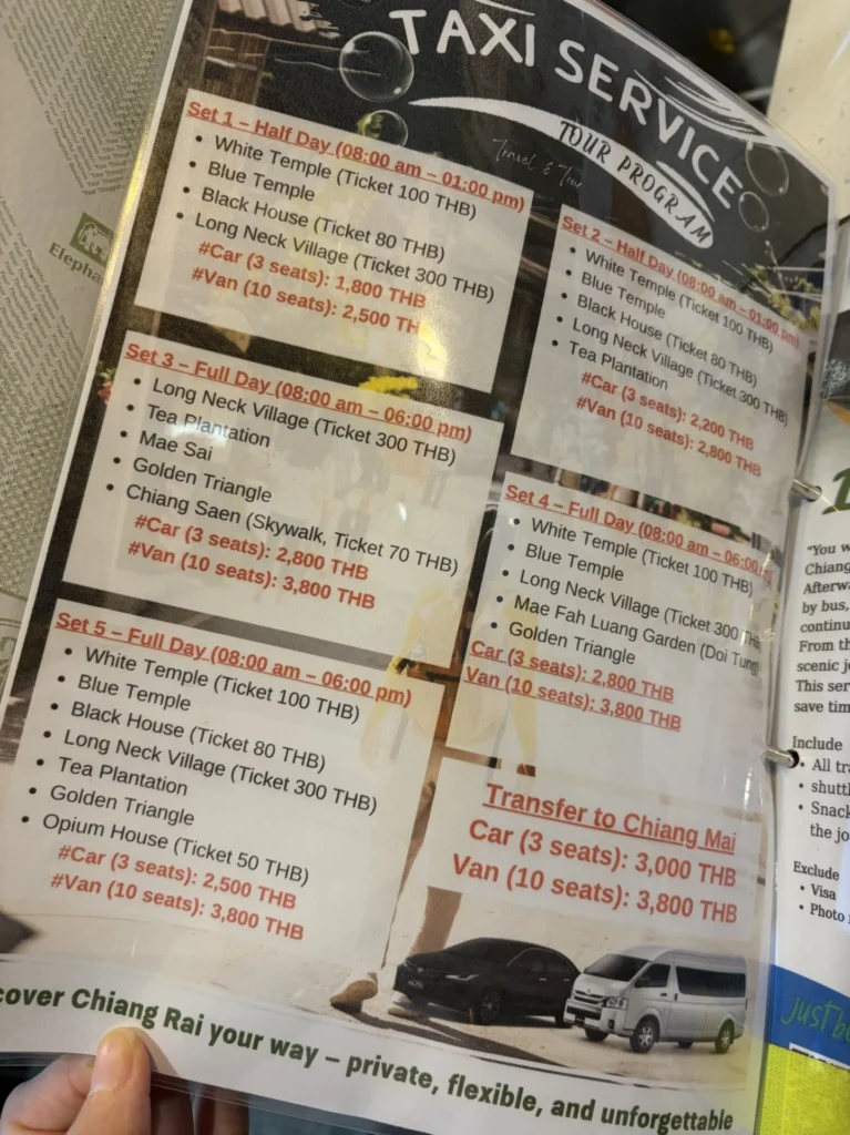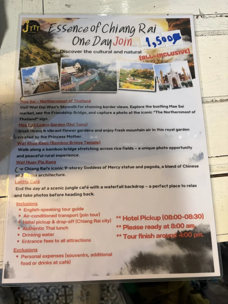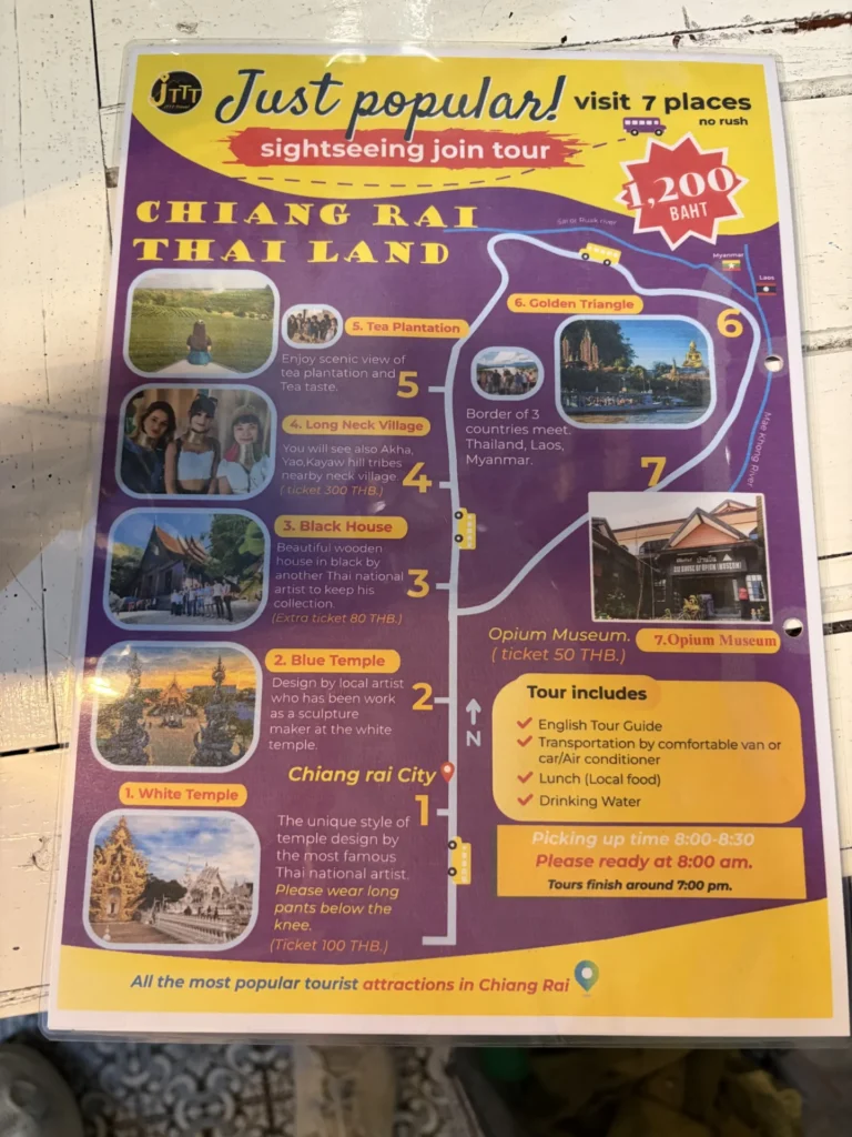 私はホテルで手配ではなく、自分でネットで見つけたツアーに参加しましたが、移動の面で大満足でしたので、チェンライに長期滞在でない限りツアー参加がおすすめです。