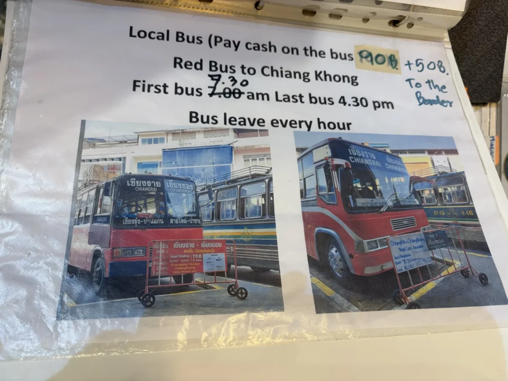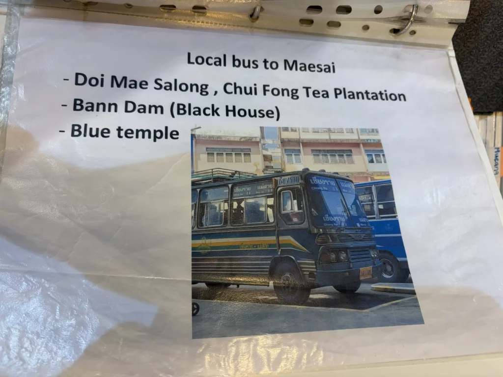 チェンライバスターミナルから、ホワイトテンプル・ブルーテンプル・黒い家や、茶園にローカルバスで行くことができます。時刻表や値段が書かれているものもあり。