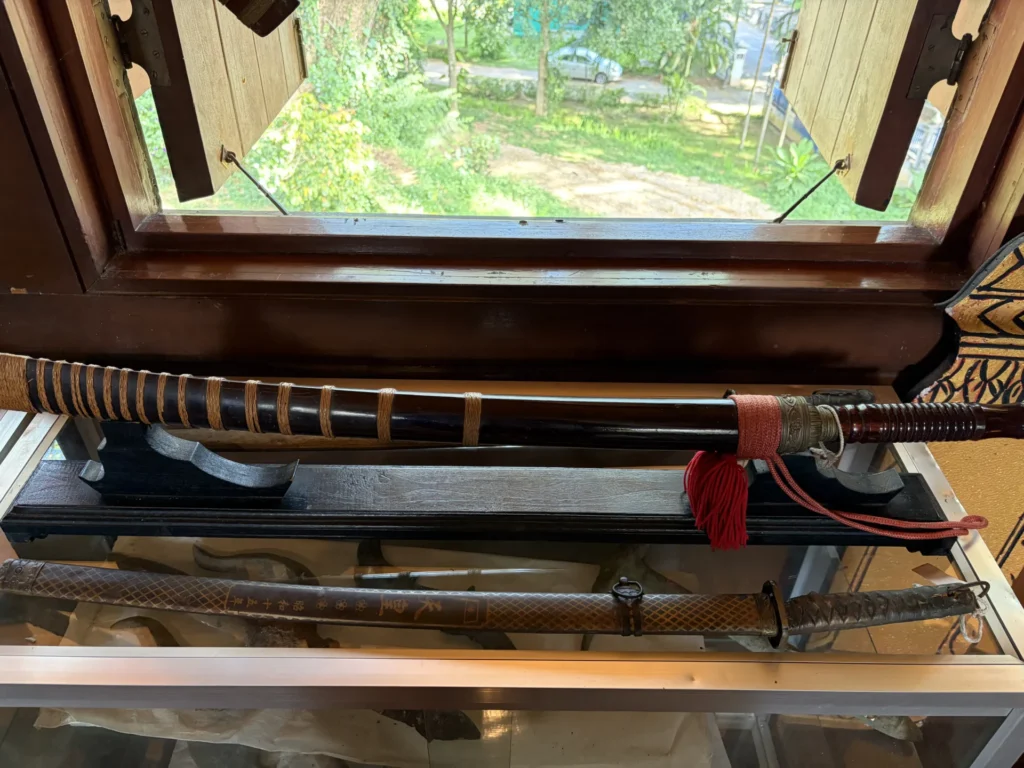 日本の国旗と、「天皇」と書かれた刀も展示されていた。第二次世界大戦時のものだという。ガラスケースの中ではなく、野晒しに室内に置いてあって、古いものだろうにだいじょうぶなの?!って感じた。(ツアーガイドのおじちゃん素手で触って見せてくれたけど、ええのか〜?)